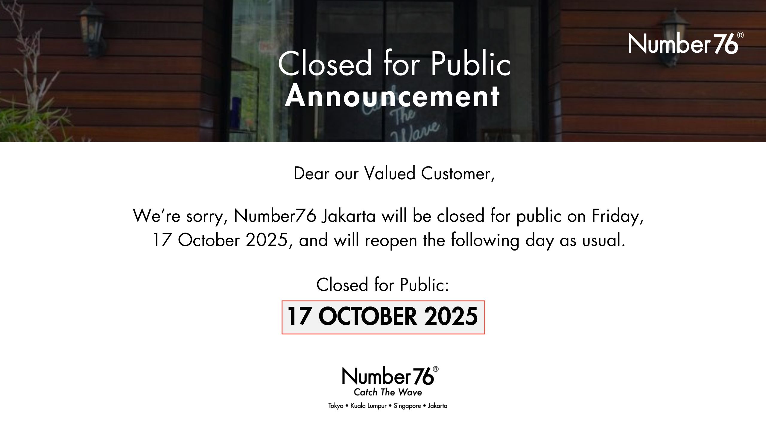 Kepada pelanggan yang terhormat, Mohon maaf untuk ketidaknyamanannya, Number76 Jakarta akan tutup un...